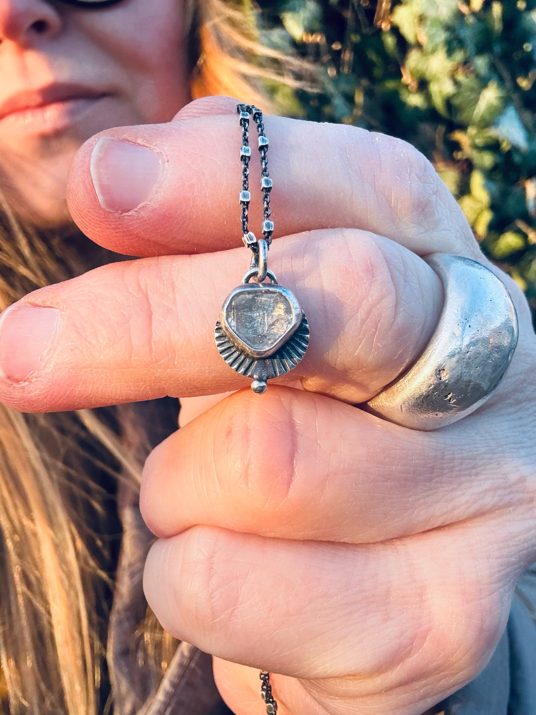 Made with a Herkimer Diamond, that was self mined in upstate NY. It shines brightly against hand stamped sterling silver. It hangs on an 18” decorative sterling silver chain. The pendants is about 0.5” long.