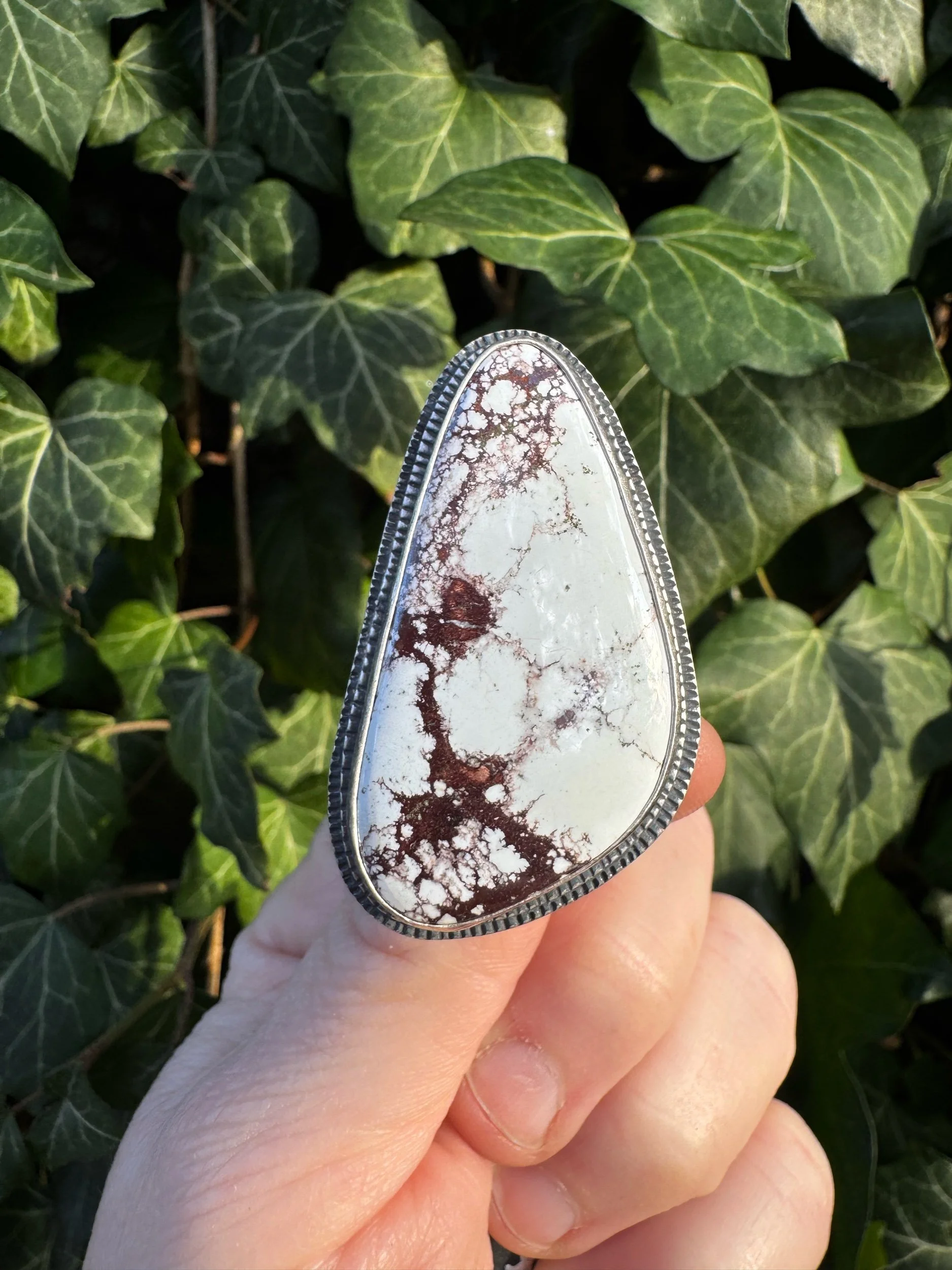 Quite a statement will be made with this ring. Featuring beautiful Wild Horse Maganesite that is about 2 inches in length. A beautiful floral band was used to add a bit more beauty.